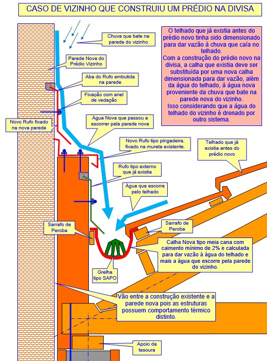 Meu telhado já tinha uma calha que suportava bem, sem transbordar, a água da chuva que caía no "meu" telhado, mas agora recebe também a água que escoa pela parede do vizinho e a calha chega a transbordar quando chove forte. Olhe bem! Pode acontecer do telhado do vizinho ter calha e recolher toda a água que cai no telhado dele mas a água da chuva que bate na parede escoa pela parede e vai cair na calha do "meu" telhado e dependendo do tamanho dessa parede a quantidade de água que vem de lá pode ser muitas vezes maior que toda a água que cai no "meu" telhado - imagine se este prédio do vizinho tem 20 andares!
