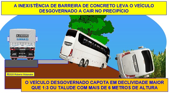 Qualquer desses obstáculos irá favorecer o tombamento do veículo. Veja um caso real de grande perigo pois a guia existente, antes do veículo atingir a Barreira de Concreto, irá funcionar como um trampolim e vai projetar o veículo para o alto podendo até o veículo sair "voando" por cima da Barreira de Concreto, invadir a outra pista e chocar-se contra outro veículo que venha em sentido contrário: