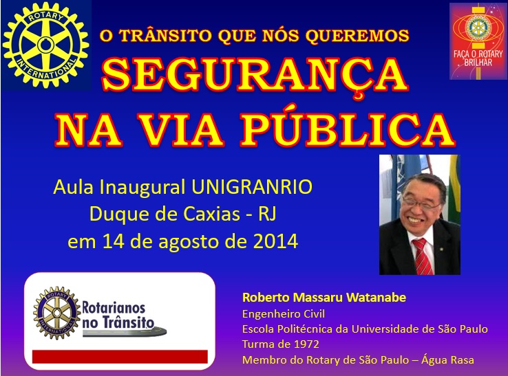 Você também pode ajudar a diminuir as mortes nas ruas e estradas brasileiras. Divulguem este site [www.ebanataw.com.br/trafegando/defensa.htm] para que mais pessoas possam acionar os órgãos públicos competentes para melhorar a qualidade das vias brasileiras e assim diminuir as mortes de trânsito no Brasil. O engenheiro Watanabe já está fazendo a sua parte mantendo sites como este e fazendo palestras em Faculdades e Universidades como este evento na UNIGRANRIO, unidade Duque de Caxias. Clique na figura e assista o video da Aula Inaugural proferida em 14 de agosto de 2014: