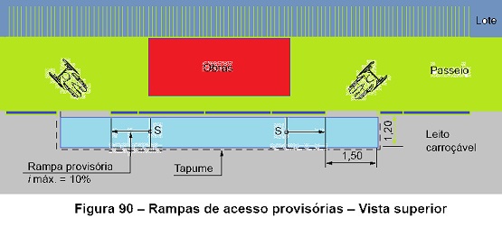 6.12.5 Obras sobre o passeio: As obras eventualmente existentes sobre o passeio devem ser convenientemente sinalizadas e isoladas, assegurando-se a largura mínima de 1,20 m para circulação, garantindo-se as condições de acesso e segurança de pedestres e pessoas com mobilidade reduzida, conforme Figura 90.