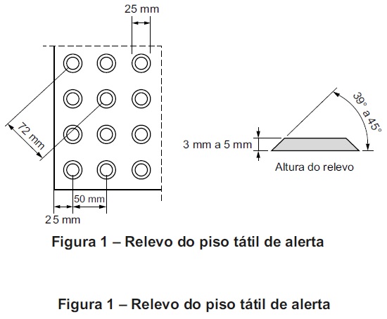 piso tátil de alerta: piso tátil produzido em padrão convencionado para formar a sinalização tátil de alerta no piso.