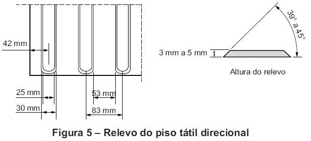 6.3.3 Inclinação: A inclinação transversal da superfície deve ser de até 2 % para pisos internos e de até 3 % para pisos externos. A inclinação longitudinal da superfície deve ser inferior a 5 %. Inclinações iguais ou superiores a 5 % são consideradas rampas e, portanto, devem atender a 6.6.