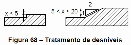 6.3.4 Desníveis: Desníveis de qualquer natureza devem ser evitados em rotas acessíveis. Eventuais desníveis no piso de até 5 mm dispensam tratamento especial. Desníveis superiores a 5 mm até 20 mm devem possuir inclinação máxima de 1:2 (50 %), conforme Figura 68. Desníveis superiores a 20 mm, quando inevitáveis, devem ser considerados como degraus, conforme