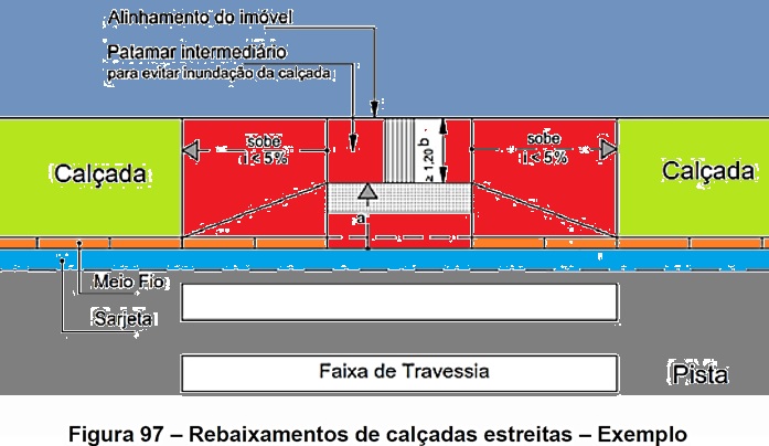 6.12.7.3.4 Em calçadas estreitas onde a largura do passeio não for suficiente para acomodar o rebaixamento e a faixa livre com largura de, no mínimo, 1,20 m, pode ser feito o rebaixamento de rampas laterais com inclinação de até 5 %, ou ser adotada, a critério do órgão de trânsito do município, faixa elevada de travessia, ou ainda redução do percurso de travessia. A Figura 97 demonstra um exemplo de solução.