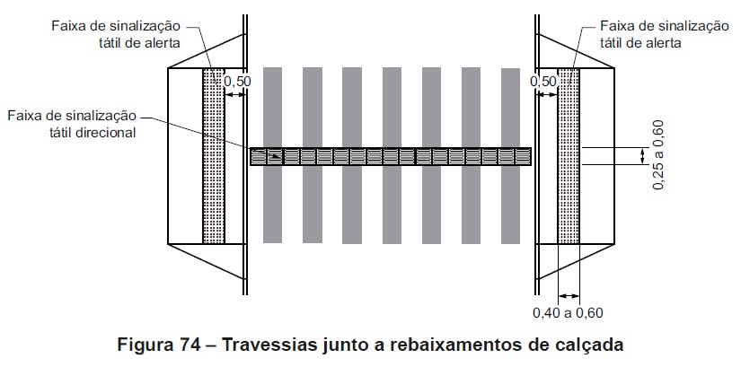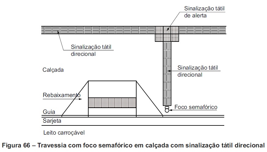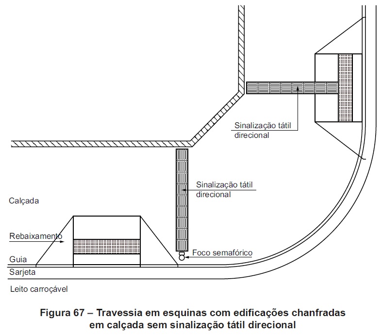 6.12.7 Travessia de pedestres em vias públicas ou em áreas internas de edificações. As travessias de pedestres nas vias públicas, nas vias de áreas internas de edificações ou em espaços de uso coletivo e privativo, com circulação de veículos, devem ser acessíveis das seguintes formas: com redução de percurso, com faixa elevada ou com rebaixamento de calçada. A definição da localização das travessias nas vias públicas (no meio de quadra, próximo às esquinas ou nas esquinas) é de responsabilidade do município.