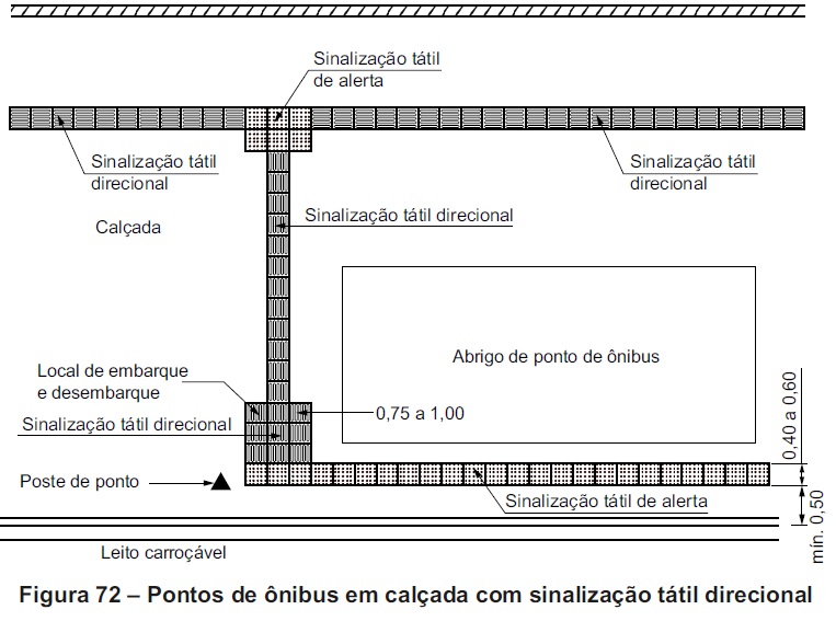 As tampas devem ser firmes, estáveis e antiderrapantes sob qualquer condição, e a sua eventual textura, estampas ou desenhos na superfície não podem ser similares à da sinalização de piso tátil de alerta ou direcional.6.12.3 Dimensões mínimas da calçada: A largura da calçada pode ser dividida em três faixas de uso, conforme definido a seguir e demonstrado pelas Figuras 88 e 89:
