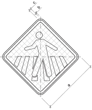 Placa que adverte sobre a existência de uma faixa de travessia de pedestres. As dimensões e cores são regulamentadas pelo Volume II do Manual Brasileiro de Sinalização de Trânsito do Conselho Nacional de Trânsito - CONTRAN que aprovou na forma de Resolução n0 243 de 22 de junho de 2007. A placa deve ser colocada no lado direito da via.