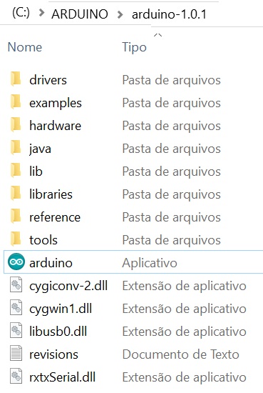 Sugiro criar uma pasta \ARDUINO e baixar o Editor Arduino lá: Depois de baixado, você verá uma lista de pastas e programas como a seguinte: