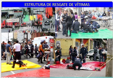 Em casos em que há pessoas feridas, a Defesa Civil providencia em local seguro e acessível por ambulâncias, 3 tipos de tapetes nas cores vermelho, amarelo e verde em função da gravidade.