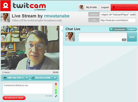 A tela mostra um meter para o volume do som e em "viewer" a quantidade de pessoas conectadas, mostra em LINK o endereço de conexão para quem quer assistir (no caso do exemplo é http:twitcam.com/4uhzm) e oferece um CHAT onde onde as pessoas que estão assistindo possam entrar em contato contigo.