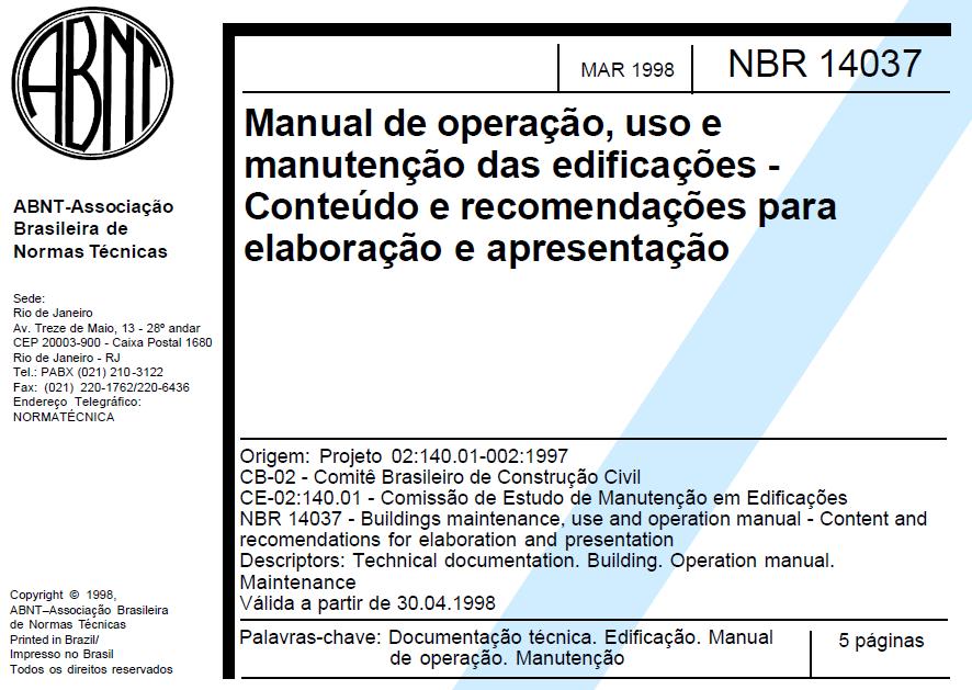 Para que o Manual do Usuário contemple todas essas finalidades, a Associação Brasileira de Normas Técnicas elaborou a norma NBR-14037 - norma que ajuda na elaboração e apresentação do Manual de Operação, Uso e Manutenção das Edificações.