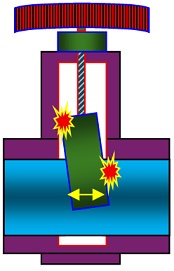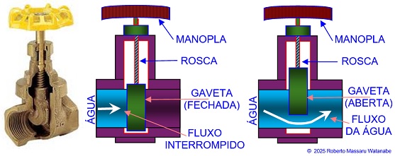 Girando a Manopla com a mão fazemos com que a Gaveta suba e desça aumentando ou diminuindo a área da tubulação podendo interromper ou permitir a passagem de mais ou menos de água.