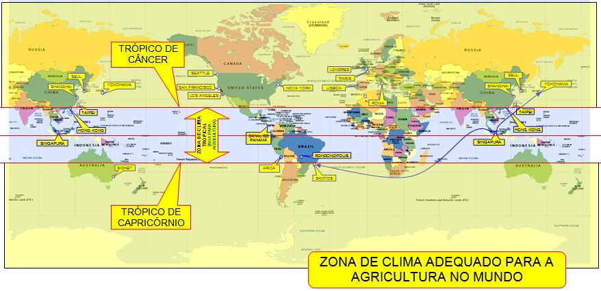 Observe que a faixa de Clima Tropical é relativamente estreita e deixa de fora grandes estensões de terra. No hemisfério norte, toda a América do Norte, toda a Europa, o Oriente Médio e boa parte da Ásia. O Canadá e a Rússia, por exemplo, ficam mais tempo sob gelo do que sob sol e não é possível plantar alface e outras verduras em boa parte do ano. No Hemisfério sul, a Argentina, a África do Sul e boa parte da Austrália também estão situados em regiões meio frias e com pouco sol.