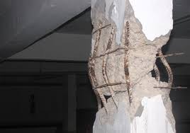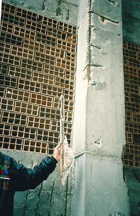 Dessa forma, com o destacamento do canto do pilar, a armadura longitudinal fica exposta ao relento. Veja um caso real em que o canto, já trincado porém ainda não destacado, "saiu" com facilidade puxando com mão:
