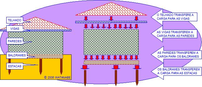 Veja como acontece a transferência de cargas entre os diversos componentes da estrutura de uma casa: