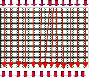 Teoricamente, o fluxo das cargas é uniforme, mas na prática essa situação de uniformidade não é encontrada pois na construção da parede empregamos materiais (blocos, tijolos, argamassa) não homogêneos que são assentados por mão de obra (João, Antonio, etc.) também não homogêneas, de modo que o fluxo das cargas dentro da parede será sempre "mais ou menos" uniforme.