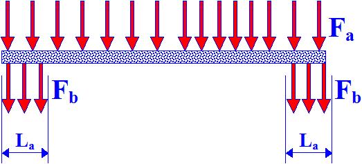 Na parte de cima da viga atuam as cargas da parede e na parte de baixo da viga, uma parte não tem apoio nenhum e nas extremidades a viga está apoiada numa parte estreita da parede, de comprimento La.