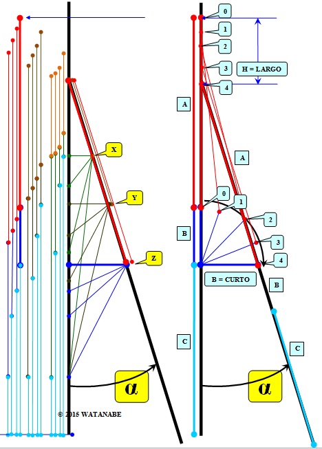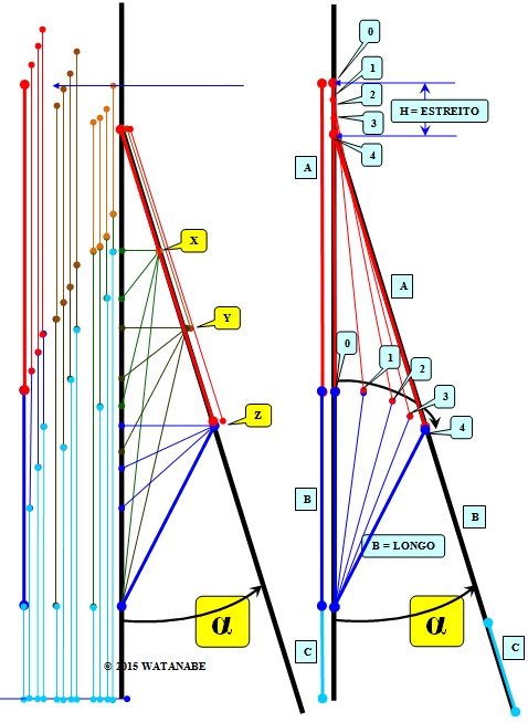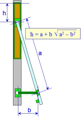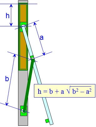 O tamanho da abertura superior "h" depende da relação entre as medidas "a" e "b". Quando "b" for bem curto, então a largura "h" vai ser bem grande. O desenho a seguir mostra as diversas posições "x", "y" ou "z" onde foi fixado o Pivô da Folha e o Pivô do Montante. É meio dificil de enxergar mas o desenho mostra as diversas posições das hastes durante o processo de abertura da janela.