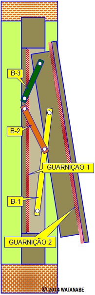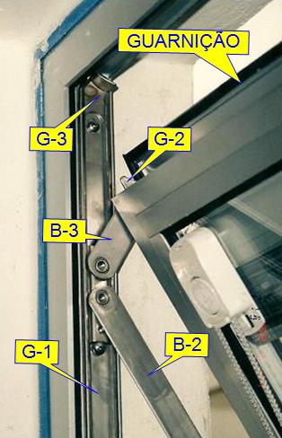 Como se pode observar na foto, no final do fechamento as guias G-2 e G-3 tem um formato tal que força um deslizamento horizontal apertando a folha móvel contra o quadro da janela. O braço B-3 ajuda nesse movimento. Nesta situação, a guarnição que dá a volta toda no quadro móvel, fica totalmente prensada contra o quadro e faz isso pelo lado de fora da janela.