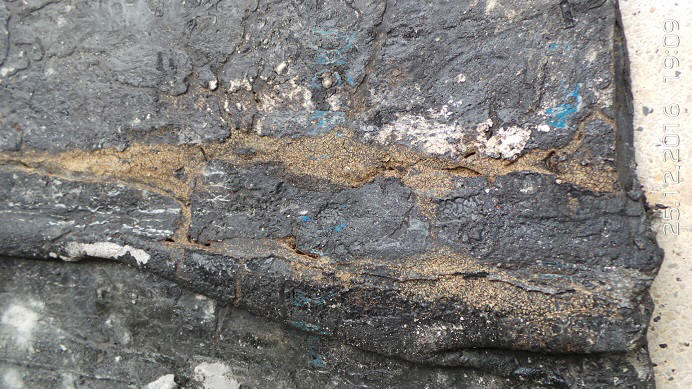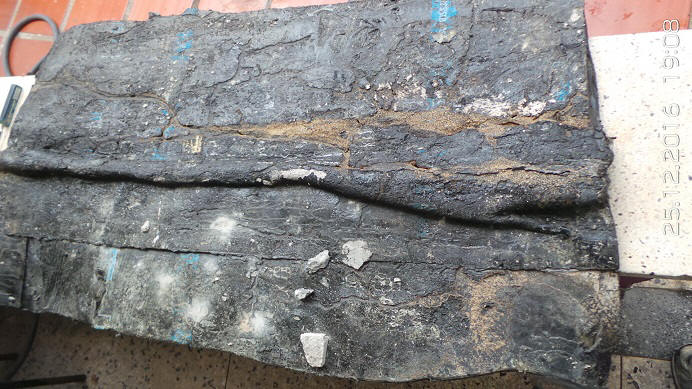 Pelo fato de ter ficado "grudado" na laje, não haveria nenhum espaço para que os cupins pudessem passear por lá, mas veja que os danados abriram caminhos "comendo" o asfalto e ainda tiveram o cuidado de forrar o caminho espalhando pó de madeira para que o solvente do asfalto não afetassem as delicadas ninfas: