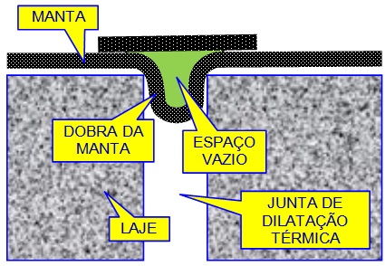 Mas, o mais surpreendente foi o que aconteceu na junta de diltatação térmica da laje de cobertura. Seguindo até recomendações do fabricante da manta asfáltica, tinha sido feita uma dobra na manta, uma folga para que a manta pudesse acompanhar o movimento de dilatação térmica da laje: