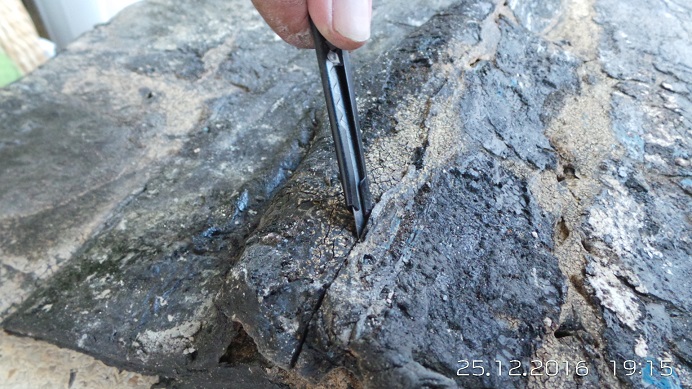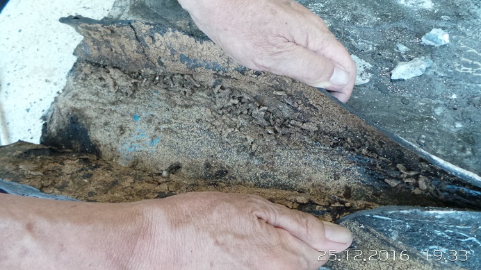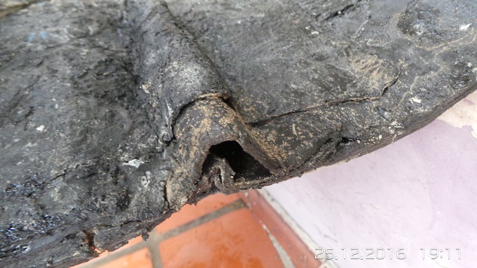 Comunicando um lado com o outro, os cupins abriram buracos e fendas na manta asfáltica: