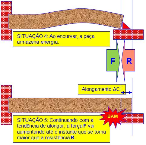 Ao continuar com a tendência ao alongamento, a peça acumula mais energia, encurvando mais até o instante que pode acontecer uma de duas coisas: