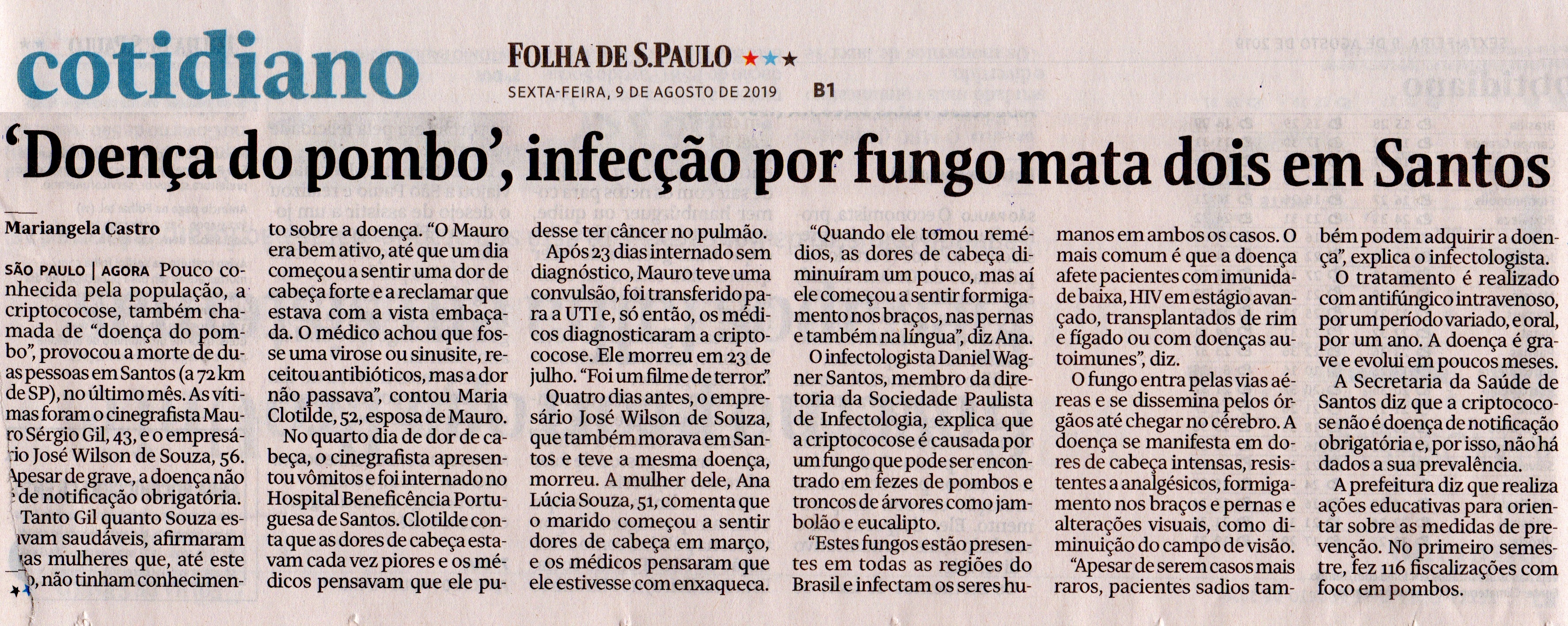Doença causada pelo fungo Cryptococus neoformans por inalação de poeira seca de pombos e passarinhos como canários. Causa alergias, micose profunda e até meningite com febre, tosse, dor torácica, rigidez da nuca, agitação e confusão mental. É também conhecida como a "doença do pombo" pois a maior parte de contágios ocorrem pela proximidade com essa ave. |