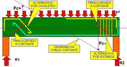 Uma alternativa é usar o próprio ferro longitudinal dobrando-os na forma de cavaletes. A outra alternativa é por meio de estribos, ferros transversais que a gente usa para ajudar a armar a viga e que é calculada para absorver o restante da força cortante.