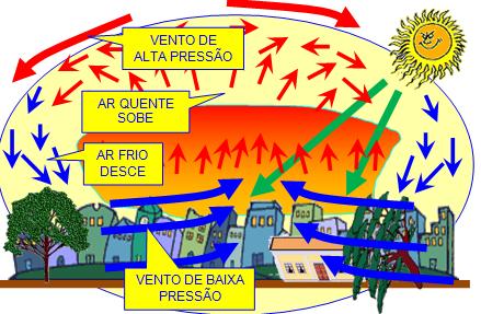 Localmente, o aquecimento provocado pela radiação solar faz o ar girar na forma de correntes térmicas ascendentes e descendentes criando os ventos de alta pressão e de baixa pressão. O ar quente é mais leve e sobe (térmica ascendente) abrindo um espaço em baixo que é logo preenchido pelo ar mais frio. O ar quente que subiu, encontra, nas camadas mais altas, temperaturas baixas e esfria.