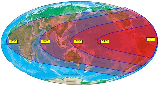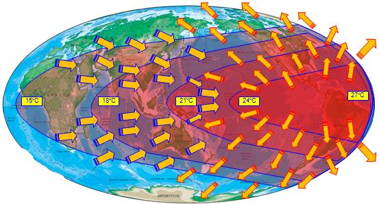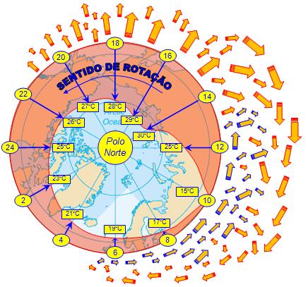 Olhando a Terra a partir de um ponto acima da linha do Equador, observamos que o gradiente das temperaturas apresenta-se, esquematicamente, da seguinte forma: