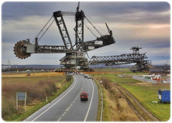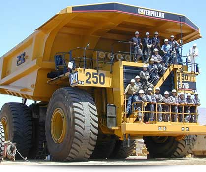 A mineração em larga escala emprega equipamentos de grande porte para escavar as rochas, transportar, britar e fazer a separação em batéias industriais.