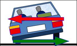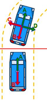 Nos trechos em curva surgem novas forças. Uma delas tende a jogar o veículo para fora da curva: é a força centrífuga e a outra segura o veículo, não deixando ele sair "voando pela tangente": é a força centrípeta. Nos desenhos das figuras 3 e 4, a força centrífuga é a força C e a força centrípeta é a força D: Quem garante a força D é o atrito entre o pneu e a pista de rolamento. Pneu careca, pista defeituosa, pista com rugosidade, pista molhada, óleo na pista e outros problemas diminuem o atrito e provocam o derrapamento do veículo na curva.