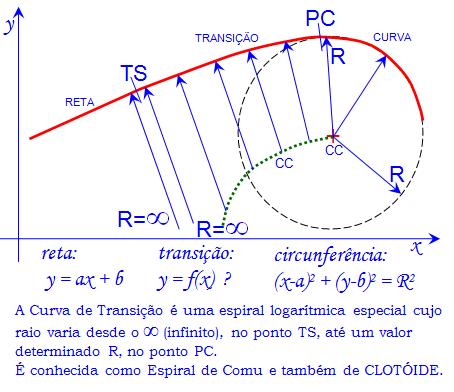 No projeto de rodovias, define-se como Curva de Transição, o trecho da rodovia que vai desde o final do Trecho Reto, ponto TS, até o Início do Trecho Curvo, ponto PC. Veja um desenho esquemático do traçado na figura 14.