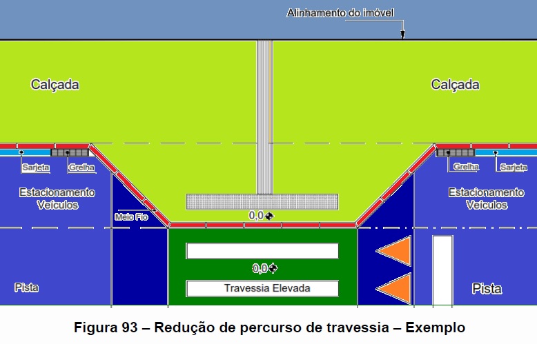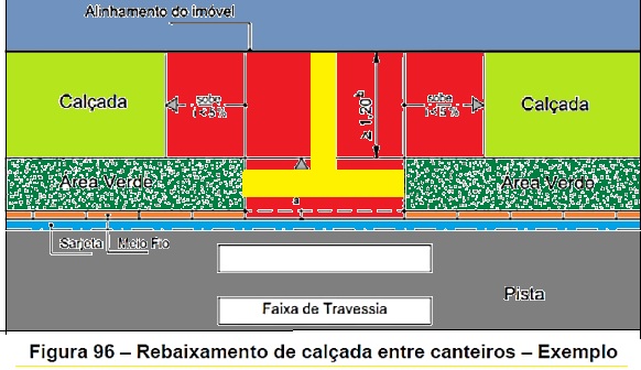 6.12.7.3.4 Em calçadas estreitas onde a largura do passeio não for suficiente para acomodar o rebaixamento e a faixa livre com largura de, no mínimo, 1,20 m, pode ser feito o rebaixamento de rampas laterais com inclinação de até 5 %, ou ser adotada, a critério do órgão de trânsito do município, faixa elevada de travessia, ou ainda redução do percurso de travessia. A Figura 97 demonstra um exemplo de solução.