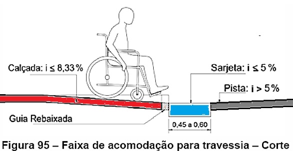 6.12.7.3.1 Não pode haver desnível entre o término do rebaixamento da calçada e o leito carroçável. Em vias com inclinação transversal do leito carroçável superior a 5 %, deve ser implantada uma faixa de acomodação de 0,45 m a 0,60 m de largura ao longo da aresta de encontro dos dois planos inclinados em toda a largura do rebaixamento, conforme Figura 95.