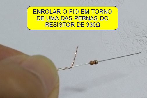 30 PASSO: Enrola a ponto do fio em torno de uma das pernas do Resistor de 330 ohms. Pode ser qualquer uma das pernas, pois o resistor não possui polaridade: