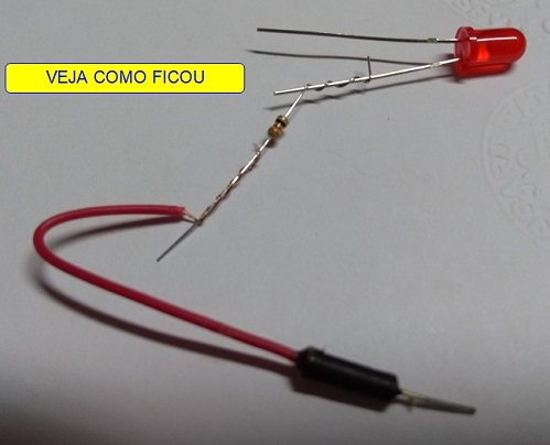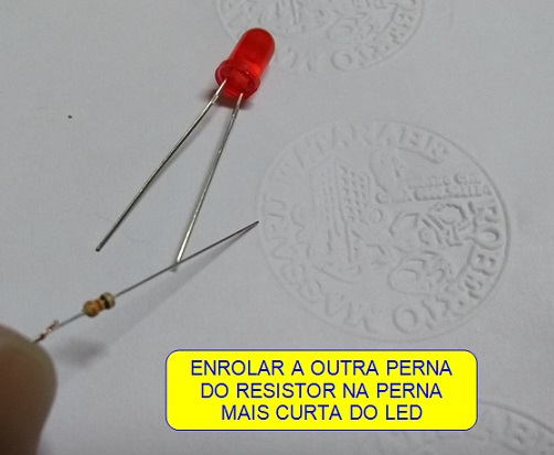 50 PASSO: Enrolar a outra perna do Resistor na Perna Mais Curta (polo negativo) do LED: