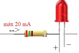 Sendo um diodo, o LED tem polaridade, isto é, uma das pernas é polo positivo e a outra é polo negativo. O polo positivo é a perna mais longa. O sentido da corrente deve ser do polo positivo para o polo negativo. Caso você ligue o LED ao contrário, isto é, entrando com a corrente pelo polo negativo, o LED não vai acender. O valor do resistor vai depender do valor da voltagem. Aplique a Lei de Ohm para calcular o valor do resitor. V = r.i isto é r = V / i Para uma tensão de 5 Volts, r = 5 / 0,020 = 250 ohms Para uma tensão de 3,5 Volts, r - 3,5 / 0,020 = 175 ohms O valor do resistor não precisa ser exatamente estes. Colocando um resistor de, por exemplo 200 ohms, na voltagem de 5 Volts, o LED acenderá mais brilhante e, ao contrário, com um resistor de 300 ohms o LED vai acender mais fraco.