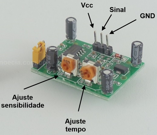 potenciômetros para ajuste da sensibilidade e tempo de acionamento da saída, e