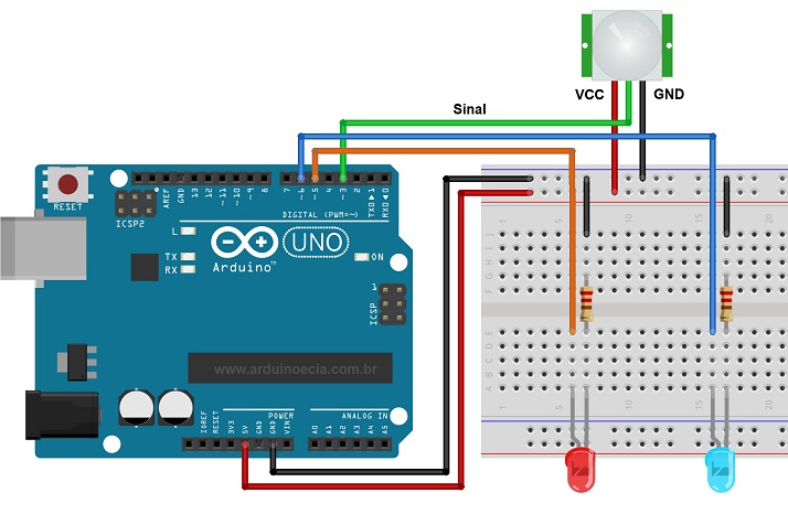 caso ocorra movimentação em frente ao sensor, o led vermelho ligado à porta 5 é