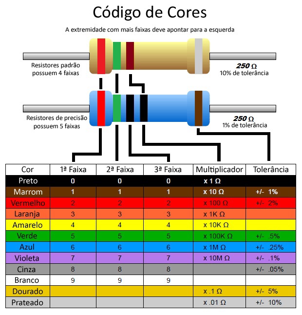 Em alguns tipo de componentes, como nos LEDs, é necessário limitar a corrente que passa para evitar que o componente se aqueça demais chegando a queimar. Para evitar o superaquecimento do LED se coloca um resistor em série. O arduino fornece 2 voltagens diferentes, uma de 5 Volts e outra de 3,5 Volts. A corrente máxima em um LED costuma ser de 20 miliVolts. O valor do resistor, que limita a corrente em 20 mV será: Para a alimentação de 5 V: r = V / i = 5 / 0,020 = 250W Para a alimentação de 3,5V: r = V / i = 3,5 / 0,020 = 175W IDENTIFICAÇÃO: Como identificar o resistor com essas capacidades de 250W ou 175W ? Os resistores, por serem componentes muito pequenos, dificultam a gravação e a leitura caso o número da resistência fosse escrito por meio de algarismos. Então foi adotada a conveção de cores: