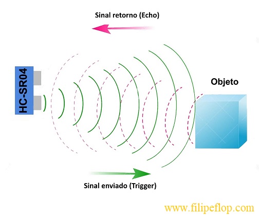 O sensor HC-SR-04 é feito de duas partes: uma que emite um raio ultrassônico (invisível e inaudível), que propaga pelo ar, e ao encontrar um objeto, reflete nele e volta. Ao voltar, a outra parte, esta sim um sensor, capta o raio refletido e fornece ao ARDUINO o tempo que o raio levou entre sair do emissor e ser captado de volta pelo receptor.