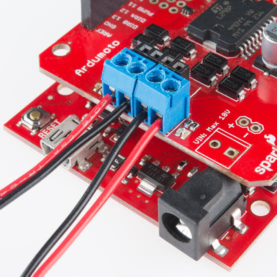 Uma vez acoplado no ARDUINO, o shield ArduMoto oferece 2 conectores (peças azuis) onde podemos conectar, diretamente, a fiação de alimentação de motores elétricos.