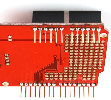 A placa acima é uma placa conhecida como ArduMoto e é fabricada pela Sparkfun e a "compatibilidade" com o ARDUINO é feita pela pinagem que sai na parte de baixo da placa. Como se vê na foto, na parte de baixo sai uma série de pinos que coincidem com os furos que tem no conector da parte de cima do ARDUINO.