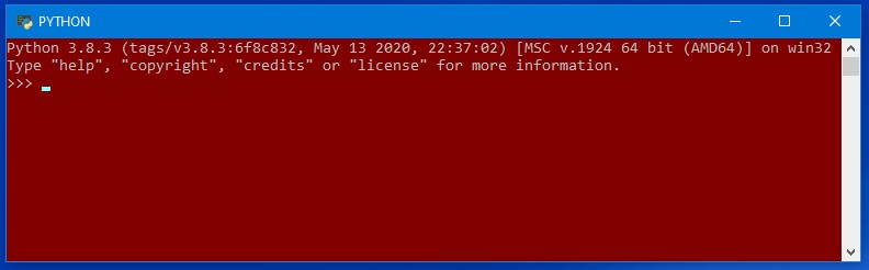 5o PASSO: O PYTHON apresenta uma tela de trabalho bastante simples como a seguinte, com um cabeçalho indicando a versão (no caso 3.8.3) e um PROMPT do tipo >>> com o cursor posicionado à frente: