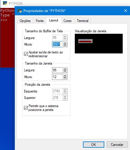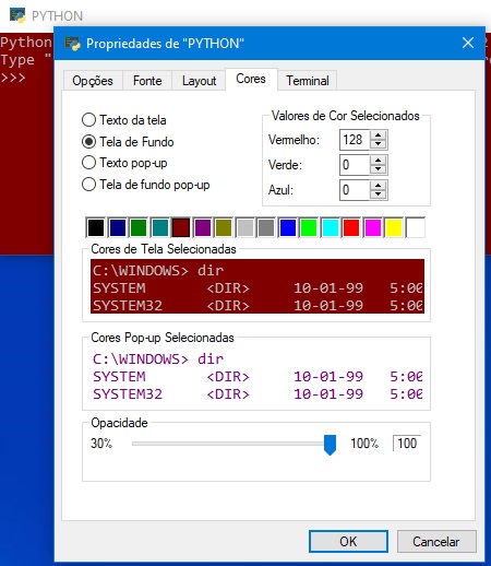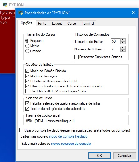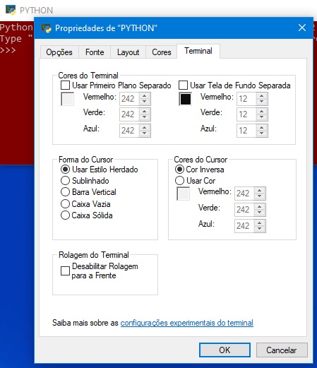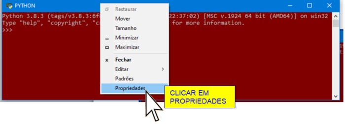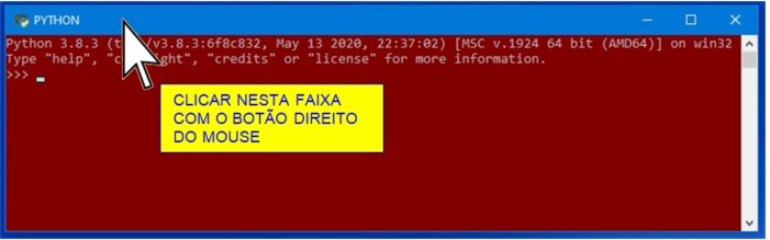 6o PASSO: O fundo da tela de trabalho do PYTHON e o tipo e tamanho das letras podem ser alterados à gosto do usuário. Para isso, posicione o cursor na faixa superior e clique o botão direito do mouse: