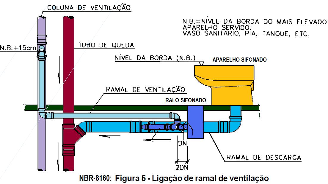 Parágrafo único – O tubo ventilador poderá ser ligado ao prolongamento de um tubo de queda acima da última inserção de ramal de esgoto.