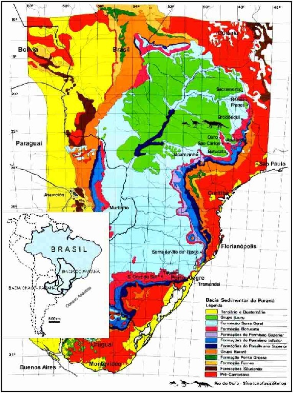 Os pontos onde o esfriamento foi rápido, formou-se lajes de basalto que é uma rocha superdura, de cor preta, cristalina e que lasca como vidro formando cantos vivos.