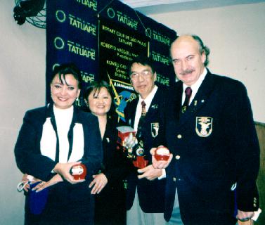 Governador 2001-02 do Distrito 4430, Romeu Giora Jr e Regina recebem seus Dharmas das mãos de Roberto e Lúcia durante a Visita Oficial ao Rotary Club de São Paulo - Tatuapé realizada em 9 de outubro de 2001.